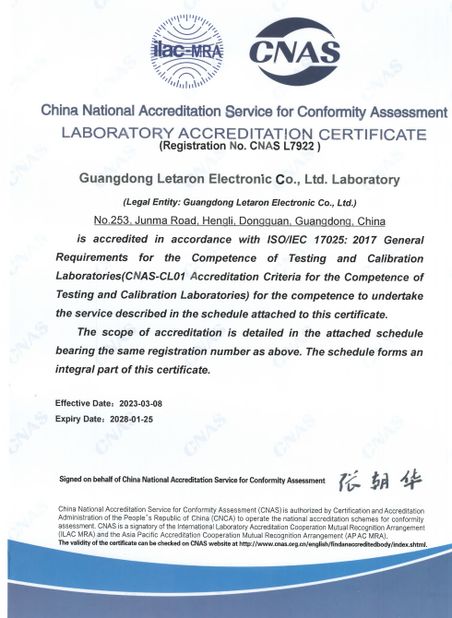 Letaron ha costruito un centro di ricerca tecnologica di qualità e ha stabilito relazioni di cooperazione stabili con organismi di certificazione autorevoli in patria e all'estero,che può fornire servizi di verifica e certificazione su una singola piattaforma per le imprese a monte e a valleNel 2021 è stata valutata come la piattaforma di servizio one-stop per l'infrastruttura nazionale di qualità (NQI) dal Ministero dell'Industria e dell'Informazione.È diventato un vantaggio competitivo unico per Letaron..
